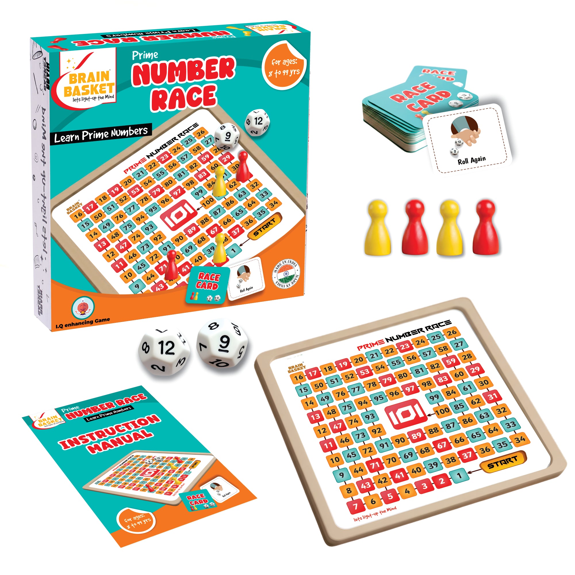Regular price Rs. 799.00Sale price Rs. 799.00 Regular price Rs. 1,299.00Unit price / perWhat’s Inside: 1 Game Board, 4 Pawns (2 per player), 2 Dice (12-sided), 30 Prime Cards, and 1 Instruction Manual Game Overview:Math Race – Learn Prime...