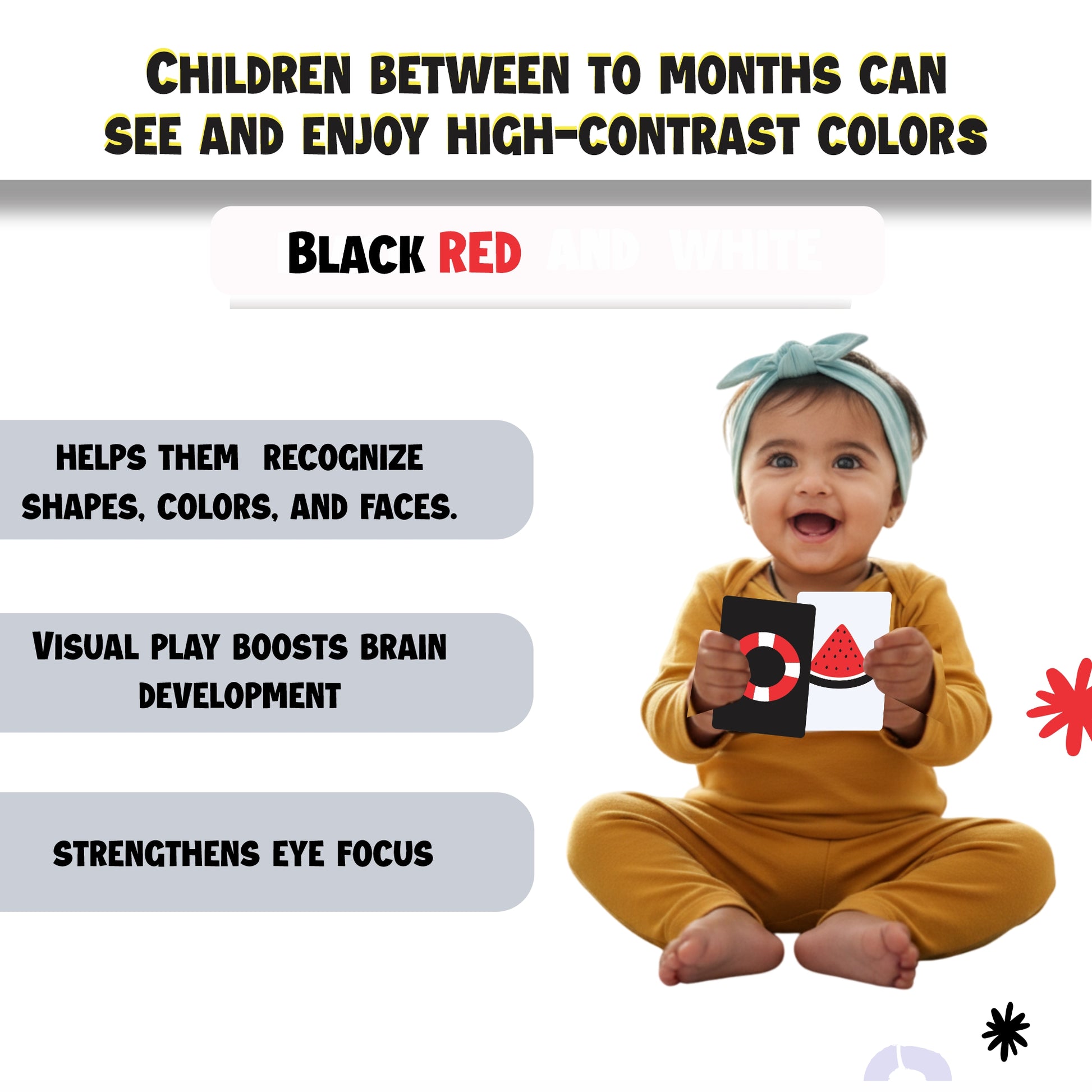 What's Inside: 36 High-Contrast Cards with bold patterns [ Black, White & Red color.